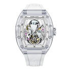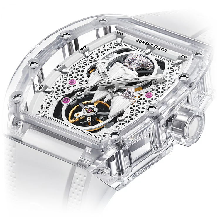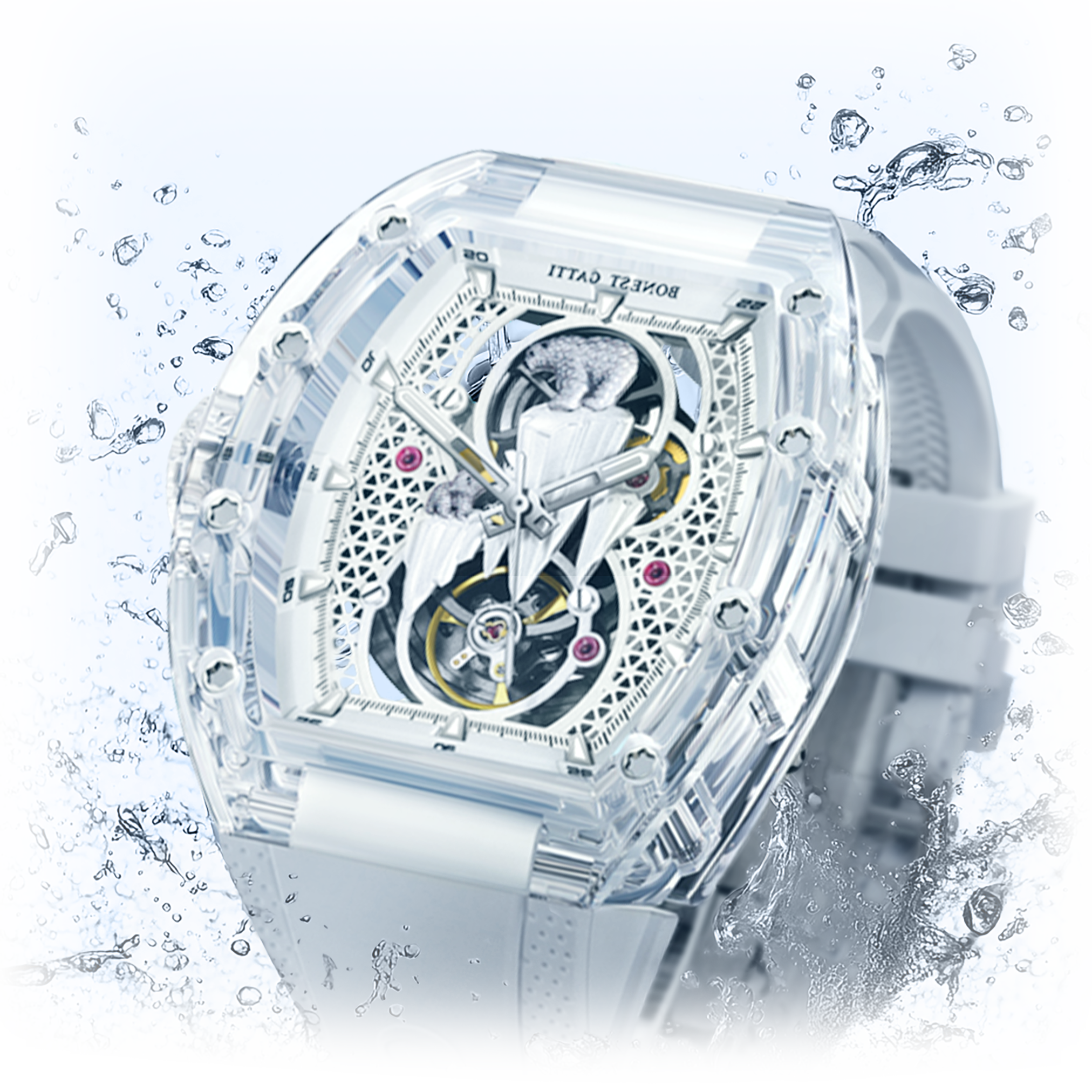 Crafted from arc-shaped crystal with up to 92% light transmittance, the 360-degree transparent watch case is polished for a hard yet lightweight finish. its clear texture offers a calm, modern aesthetic—effortlessly blending style and personality.