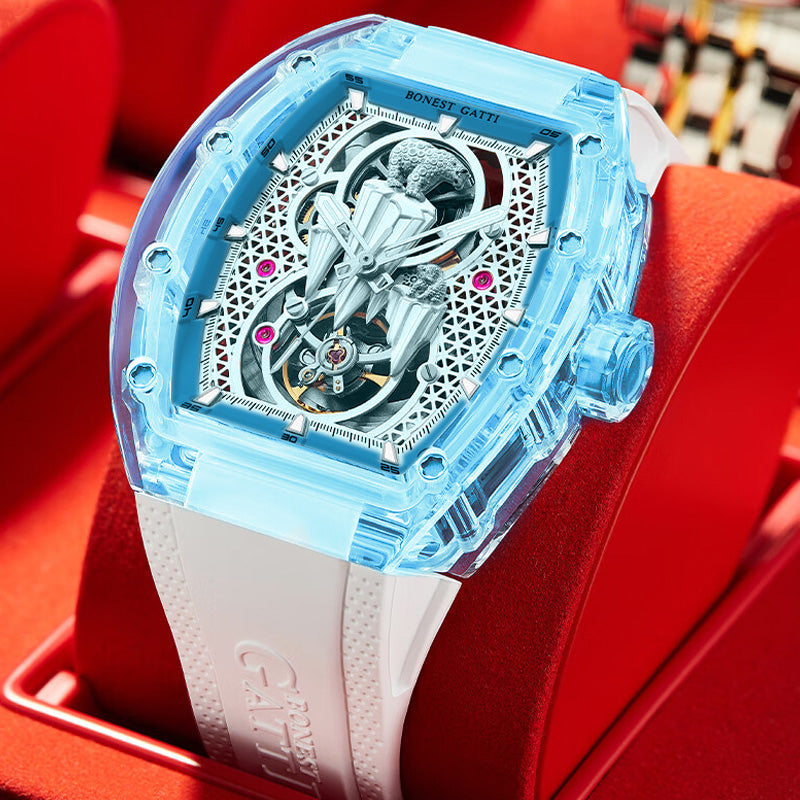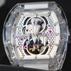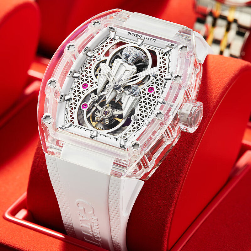 Double-sided hollow-out design with transparent bottom cover, allowing a clear view of the movement’s power. The hollow geometric structure showcases the beauty of mechanical operation.