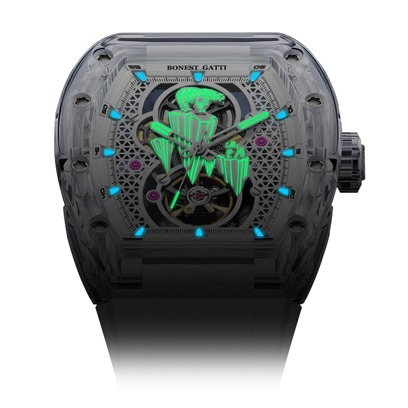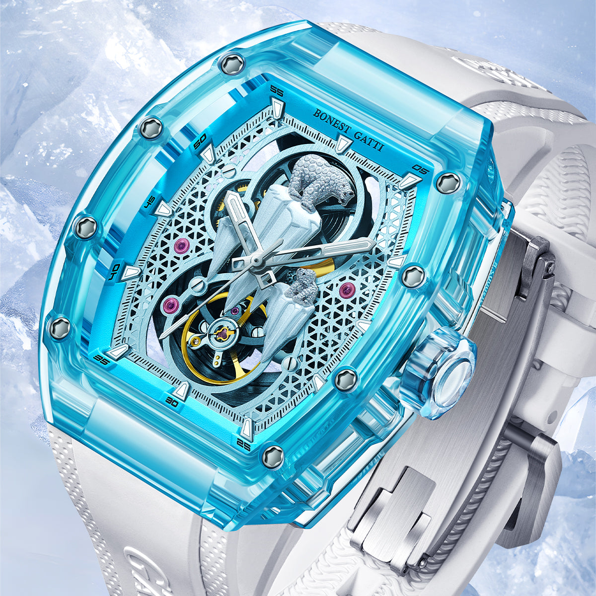 The double-sided skeleton dial reveals the captivating mechanical charm at a glance. the dial pattern evokes the allure of the arctic. german high-intensity luminous markers combined with the carbon fiber case create a striking visual effect. even in complete darkness, the time can be read clearly.