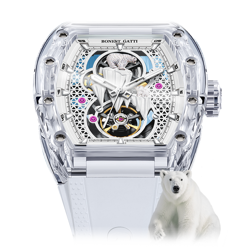 As the apex predator in the Arctic food chain, polar bears maintain the energy flow of the entire polar ecosystem. Protecting them is equivalent to protecting the entire Arctic ecosystem - this is what umbrella species mean. The watch "Guardian" is based on this concept, with the polar bear as the core element of the entire dial, while incorporating iceberg, snowflake and other designs.