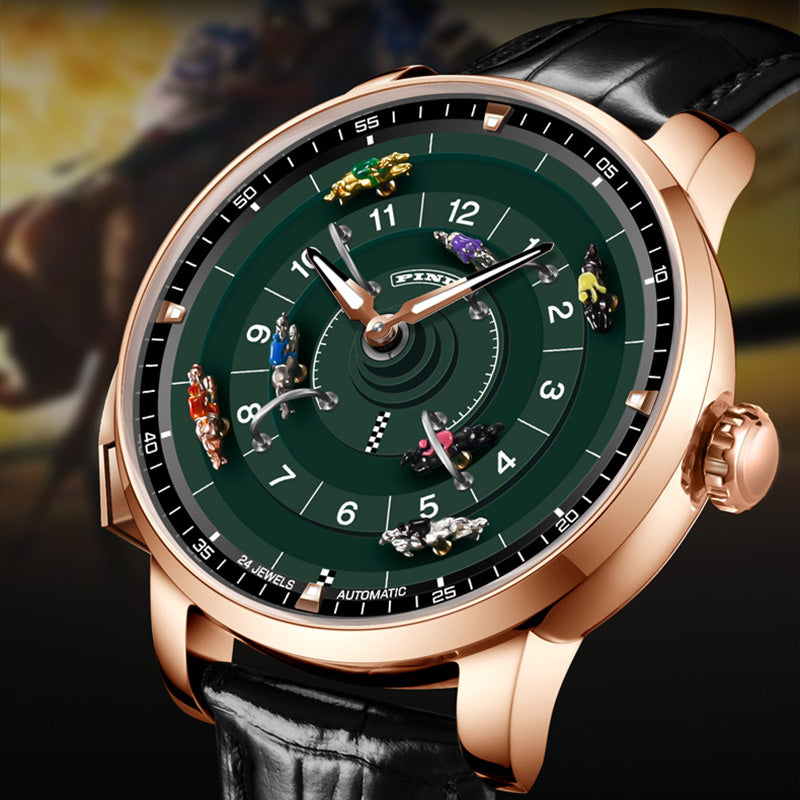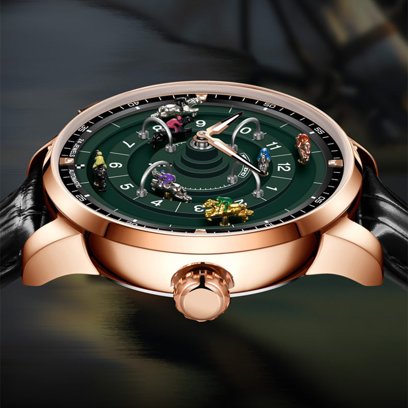 Unique horse-racing dial, with a specially designed decorated base. By pressing the button on the left side, you can recreate the thrilling moment of a horse race sprint. It creatively integrates a mechanical watch with interactive gameplay.