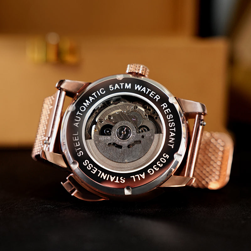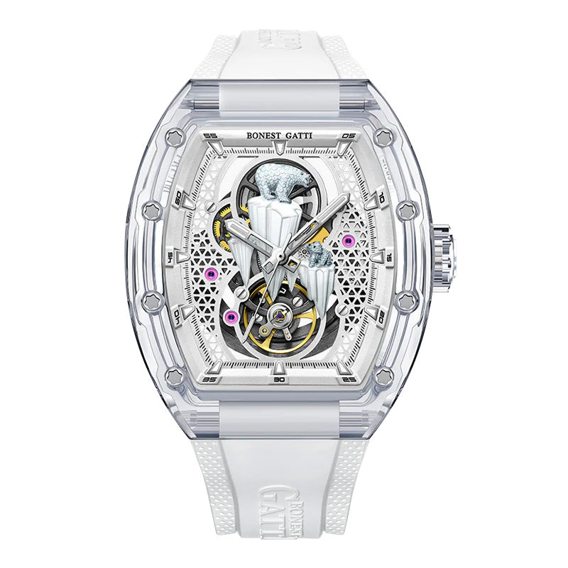 Energy visualization: Under the transparent case back, the bionic hairspring balance wheel beats at a frequency of 21,600 times/hour, conveying the primitive romance of the machine like a heartbeat.